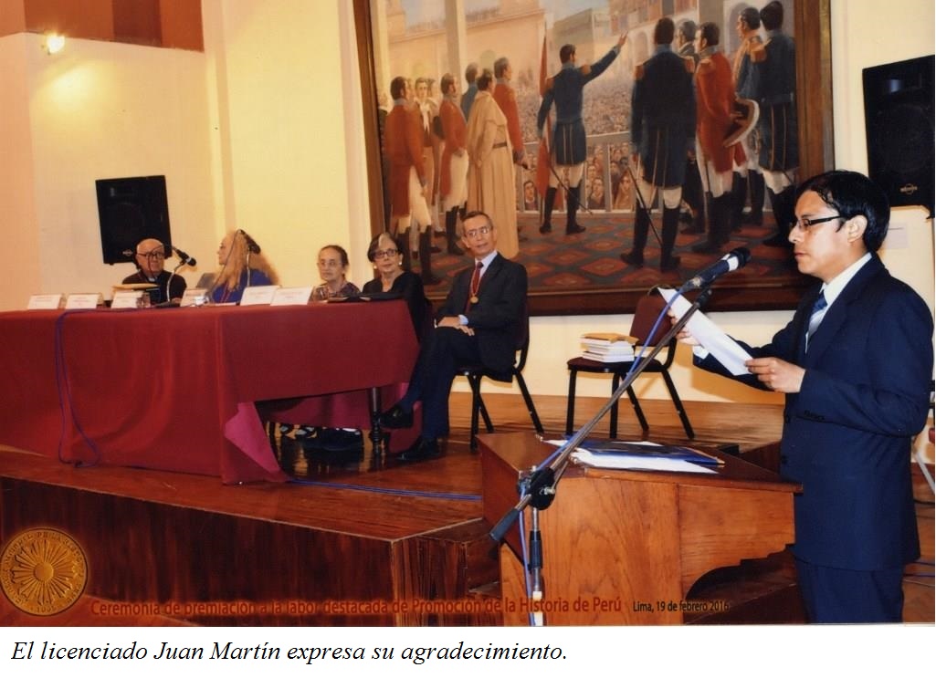 El día viernes 17 de febrero de 2017 en el auditorio del Instituto Riva Agüero, la Academia Nacional de la Historia del Perú realizó la ceremonia de premiación de las personas e instituciones que «promocionan el conocimiento de la historia, la identidad nacional y la defensa del patrimonio cultural con el fin de poner el acento en la necesidad de custodiar y promover la memoria y el análisis de nuestro pasado base de nuestra identidad y de los procesos sociales, económicos y políticos que moldearon nuestro presente e influyen en su discurrir».