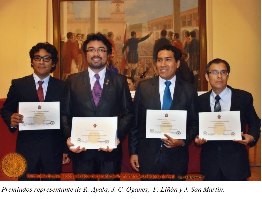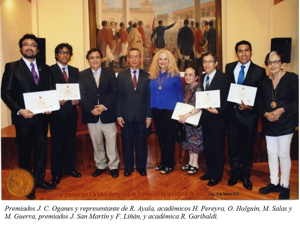 El pasado 19 de febrero, a manera de celebrar el 111° aniversario de la creación del Instituto Histórico del Perú, en la actualidad Academia Nacional de la Historia, por el presidente de la República José Pardo y Barreda y el ministro de Justicia, Culto e Instrucción Jorge Polar, se realizó la entrega del Diploma al mérito por la promoción de la Historia del Perú 2016 a los señores Roberto Ayala (Universidad Nacional de San Cristóbal de Huamanga), editor; Freddy Liñán (Universidad Nacional Mayor de San Marcos), promotor de museos y exposiciones a nivel de la educación secundaria; Juan Carlos Oganes (Pontificia Universidad Católica del Perú), cineasta; y Juan San Martín (Universidad Nacional Federico Villarreal), editor, los cuales expresaron sus motivaciones e ideales, así como su reconocimiento a la institución.