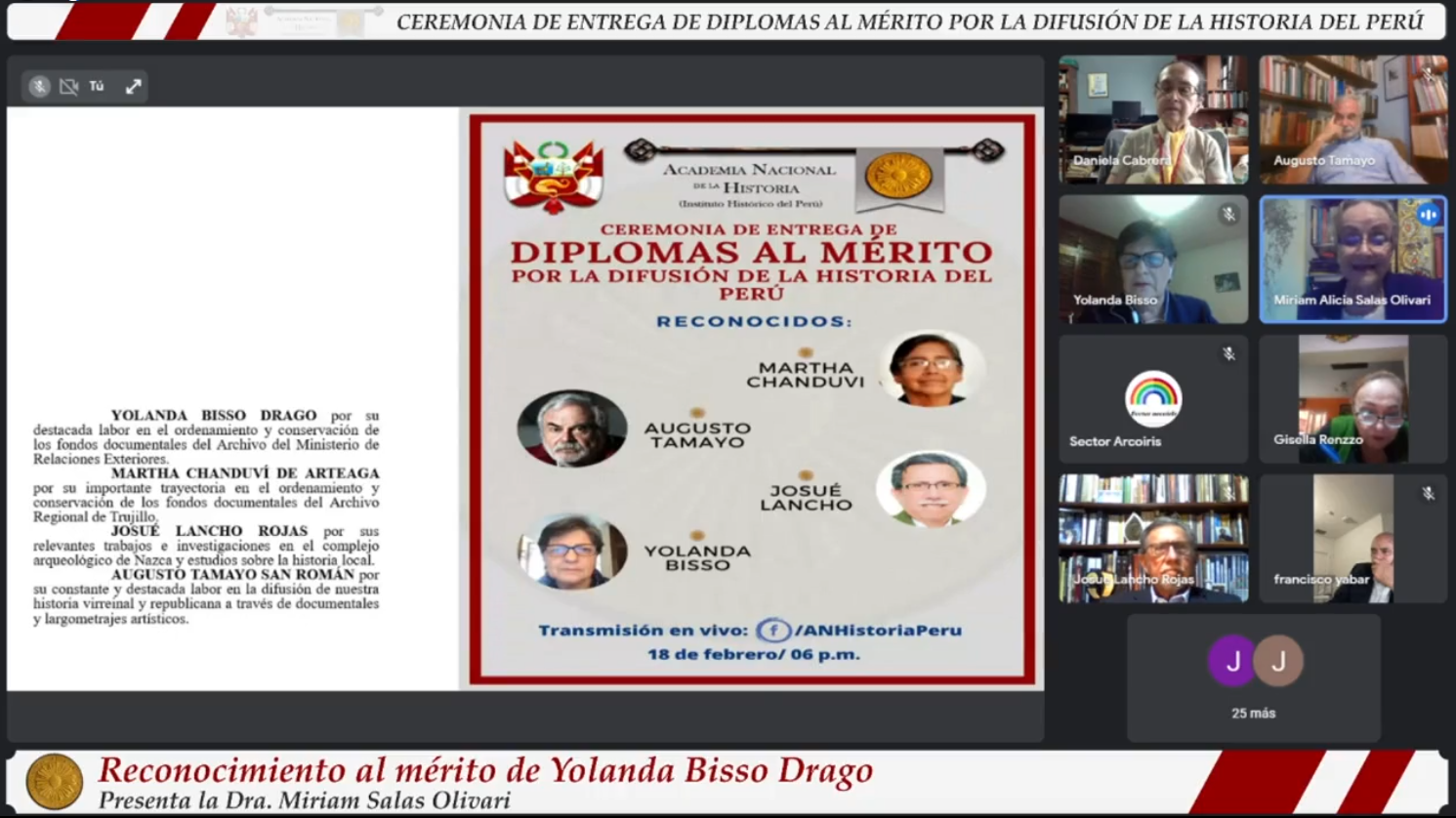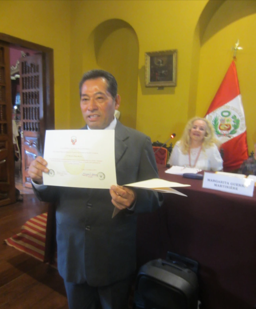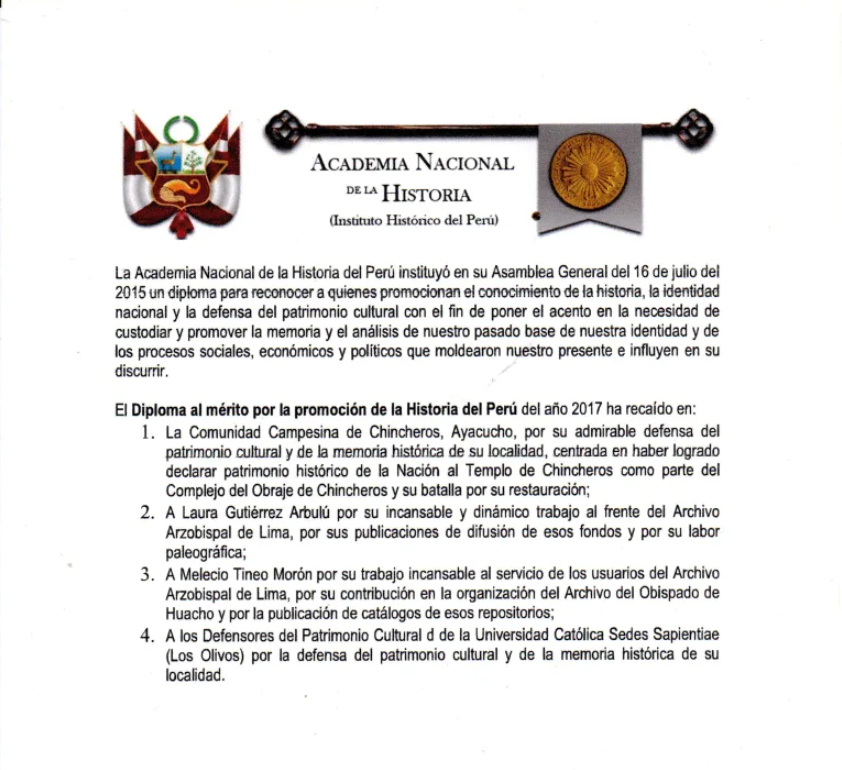 “La Academia Nacional de la Historia del Perú instituyó en su Asamblea General del 16 de julio el 2015 un diploma para quienes promocionan el conocimiento de la historia y la defensa del patrimonio cultural, base de nuestra identidad y del proceso social que moldea nuestro presente e influye en nuestro devenir”
