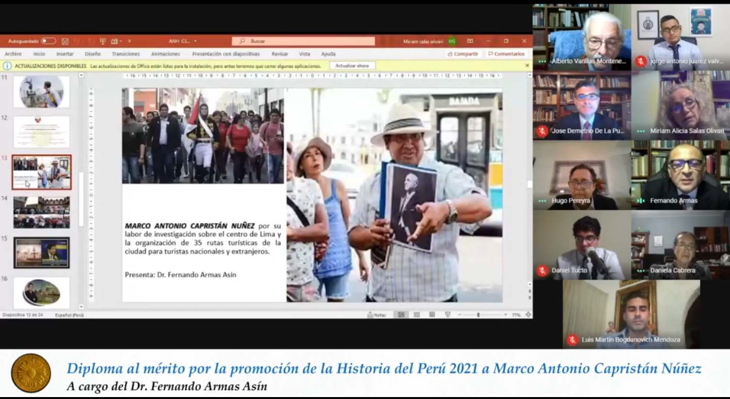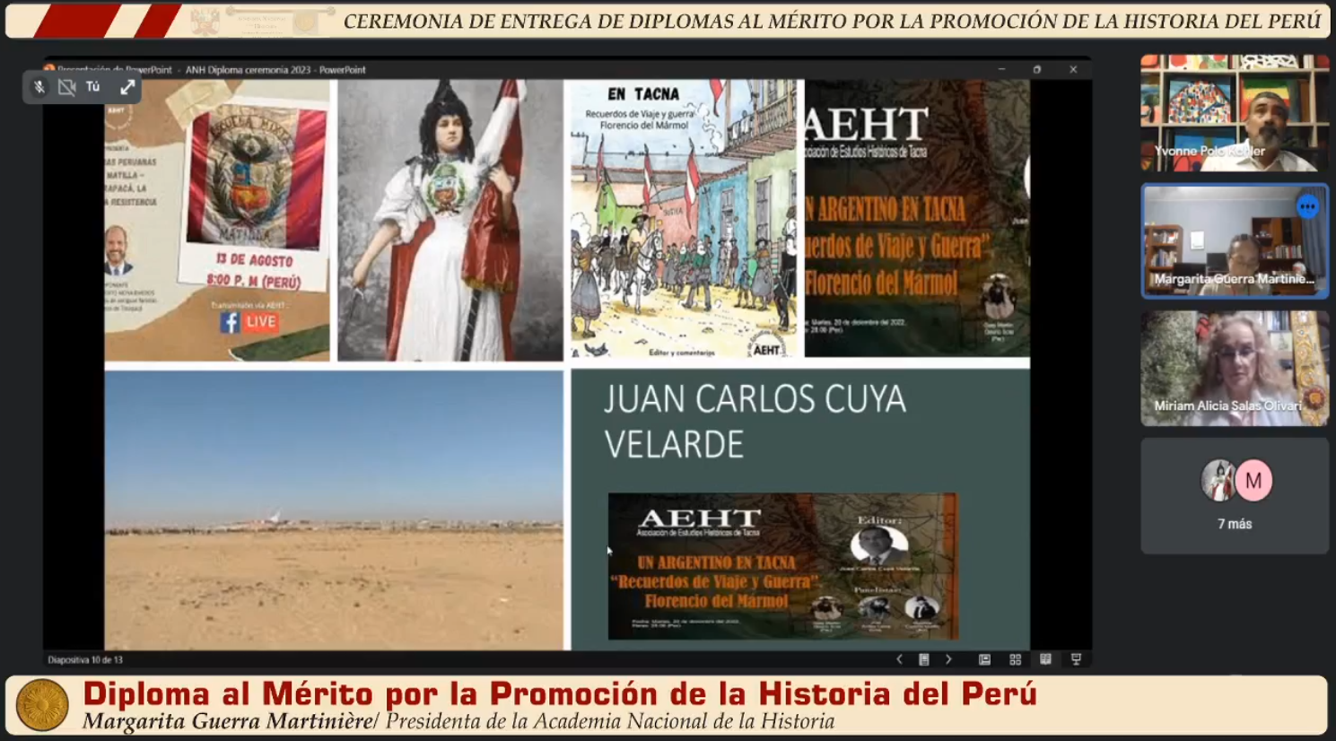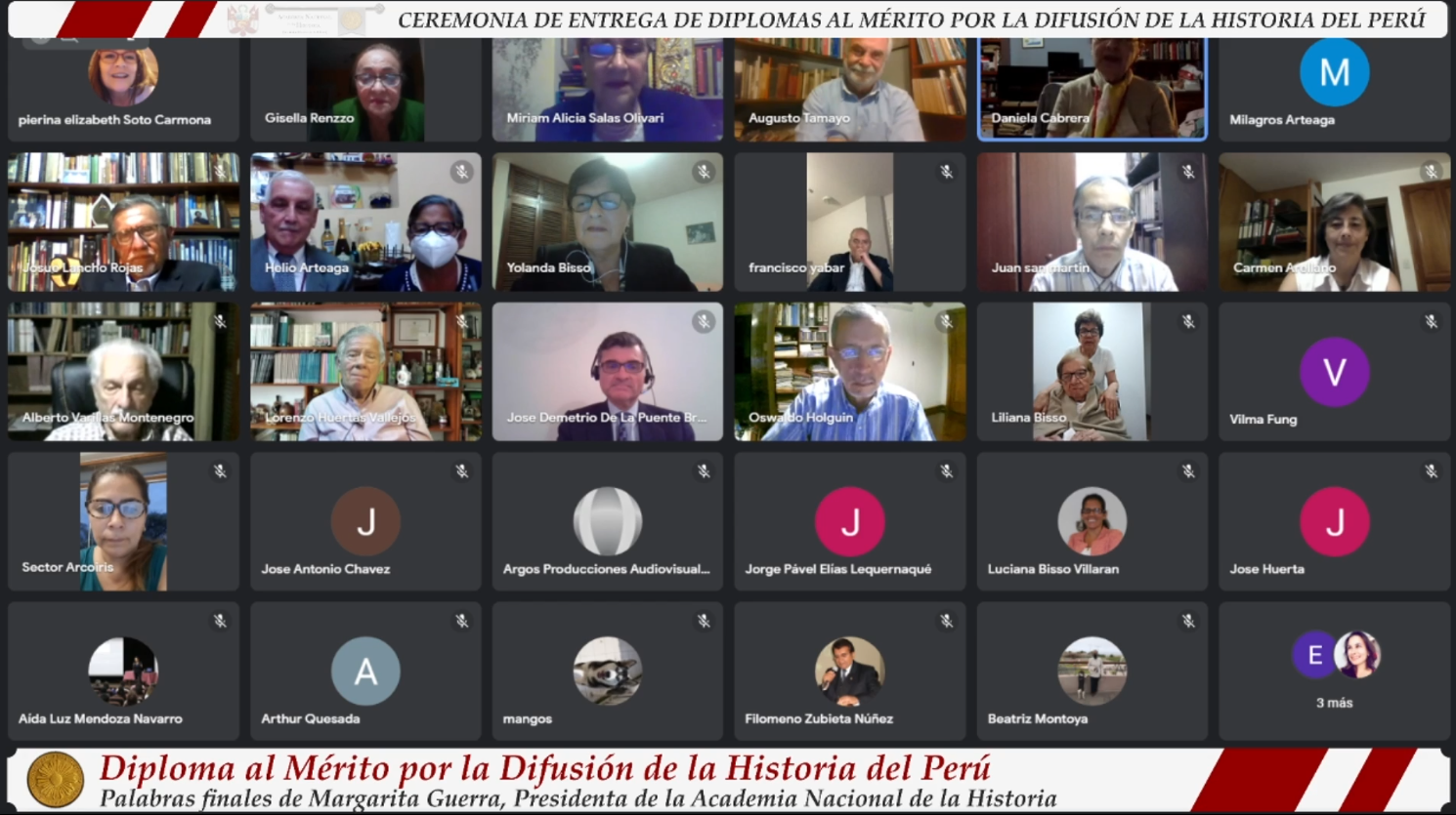 “La Academia Nacional de la Historia del Perú instituyó en su Asamblea General del 16 de julio el 2015 un diploma para quienes promocionan el conocimiento de la historia y la defensa del patrimonio cultural, base de nuestra identidad y del proceso social que moldea nuestro presente e influye en nuestro devenir”