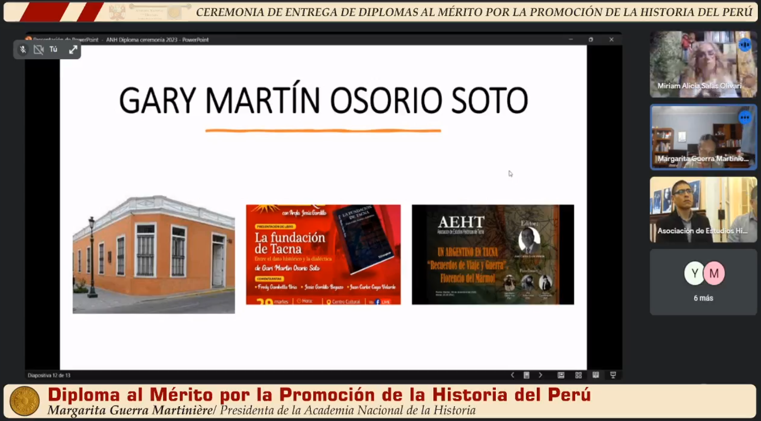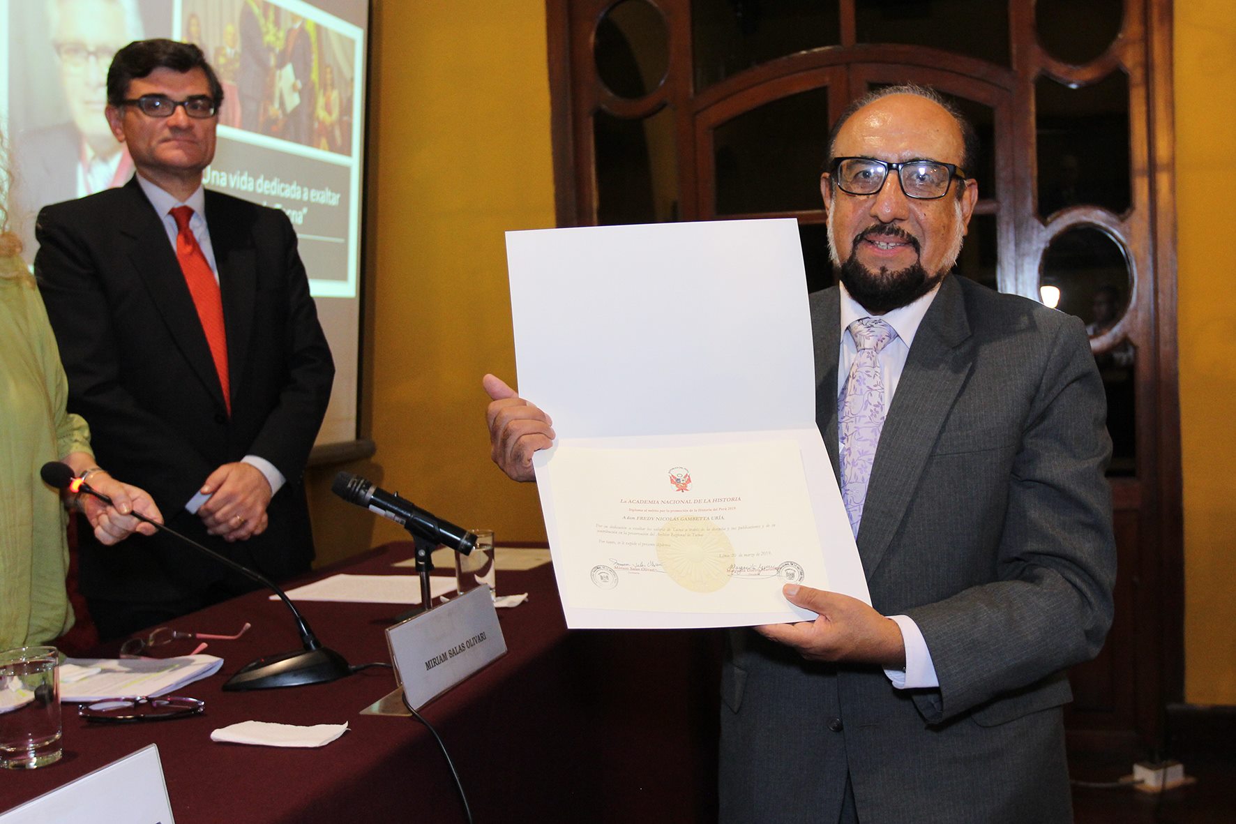 El día miércoles 20 de marzo, la Academia Nacional de la Historia, otorgó el Diploma al Mérito por la Promoción de la Historia del Perú correspondiente al año 2019 a Fredy Nicolás Gambetta Uría de Tacna, quien estuvo representado por su entrañable amigo Grover Pango Vildoso, ex Ministro de Educación; a Segundo Alejandro Alvarado Santillán de Amazonas; a Ada Elvira Arrieta Álvarez, del Instituto Riva-Agüero; y a Luis Enrique Cam, documentalista.