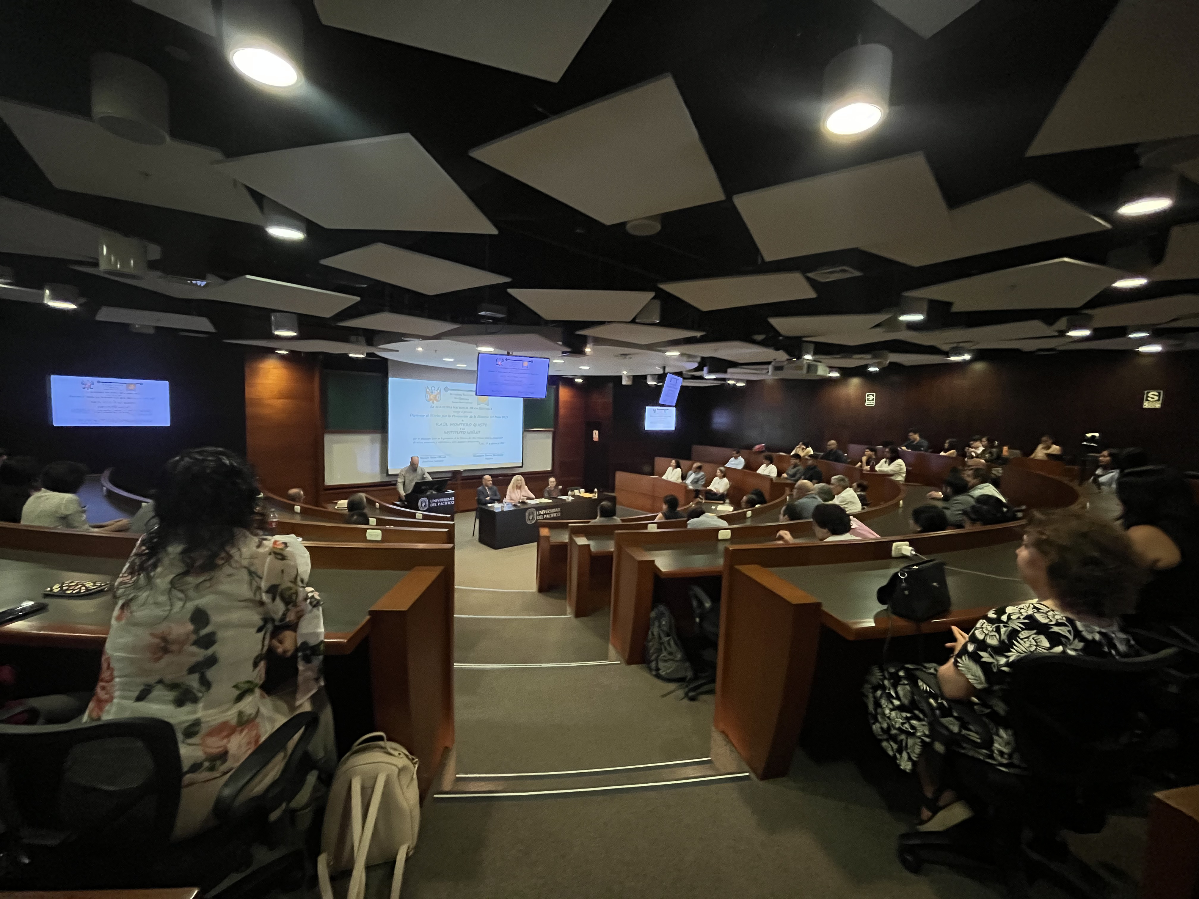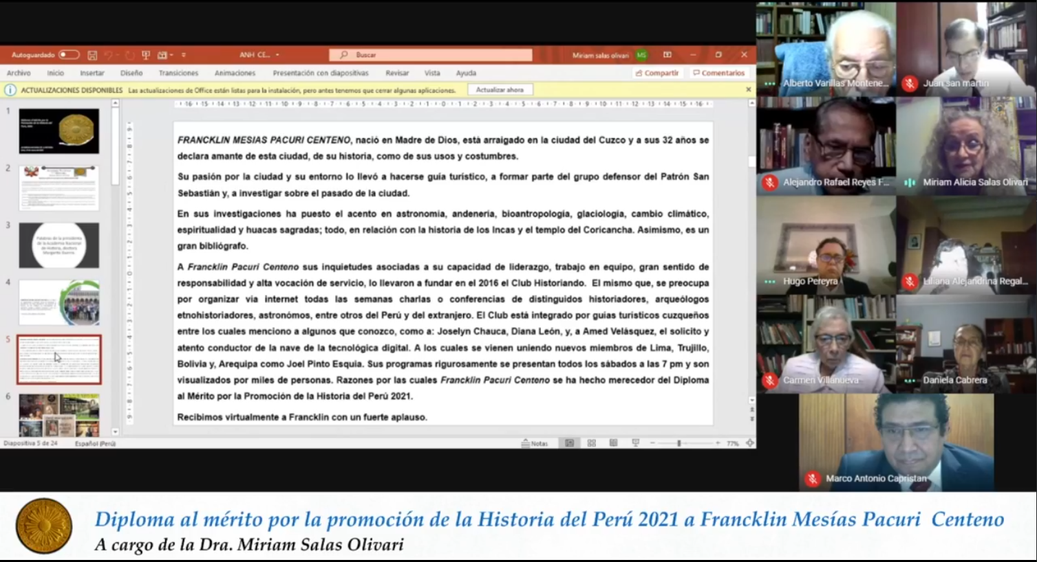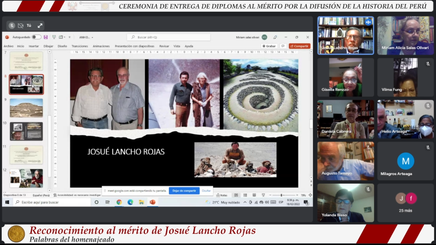 Los homenajeados fueron presentados por académicos de la institución. El doctor Fernando Armas Asín destacó la labor de Kelly Montoya y Beatriz Satizábal; la doctora Miriam Salas Olivari presentó a Michael Mendieta y Arnaldo Mera; y el contralmte. Francisco Yábar dio a conocer de manera virtual desde los Estados Unidos, las actividades del Instituto Wiñay.