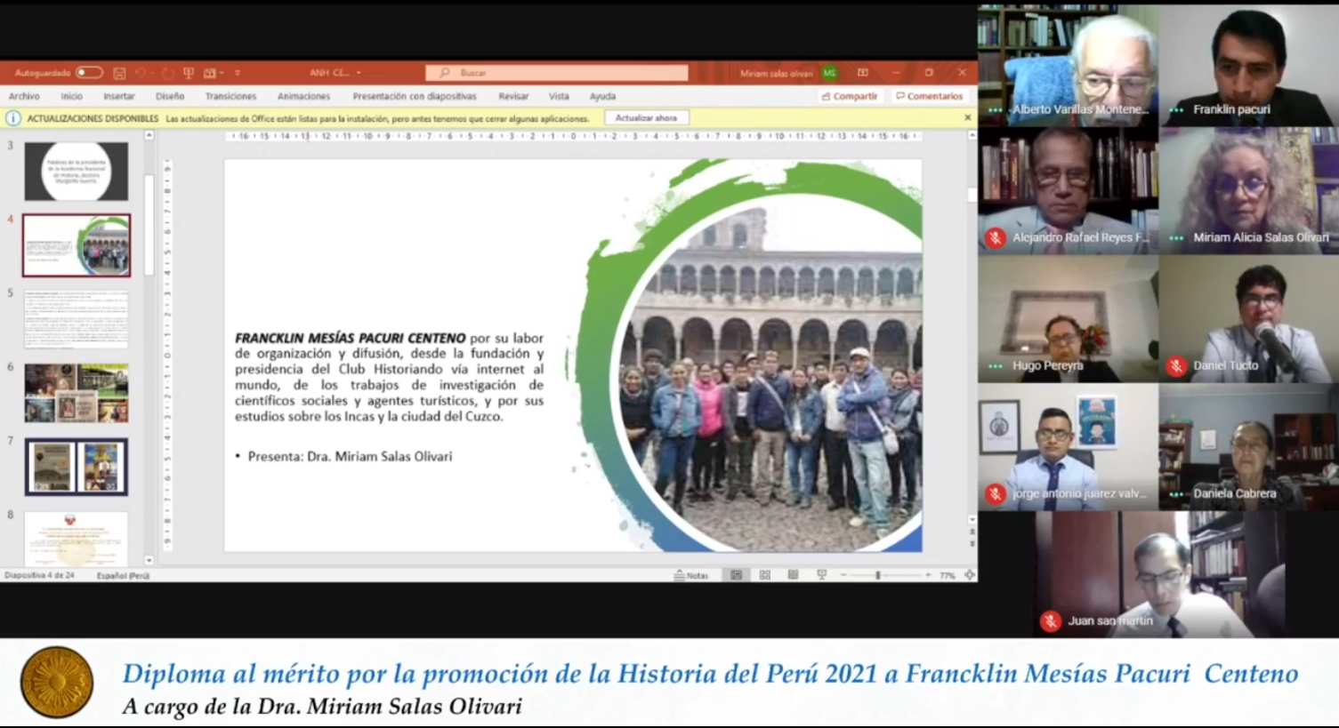 Francklin Mesías Pacuri Centeno, por su labor de organización y difusión, desde la fundación y presidencia del Club Historiando vía internet al mundo, de los trabajos de investigación de científicos sociales y agentes turísticos, y por sus estudios sobre los Incas y la ciudad del Cuzco.