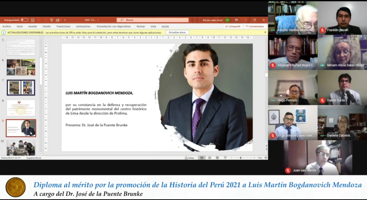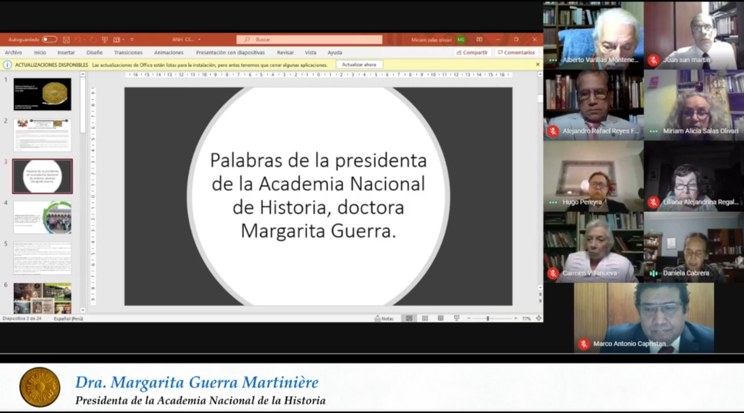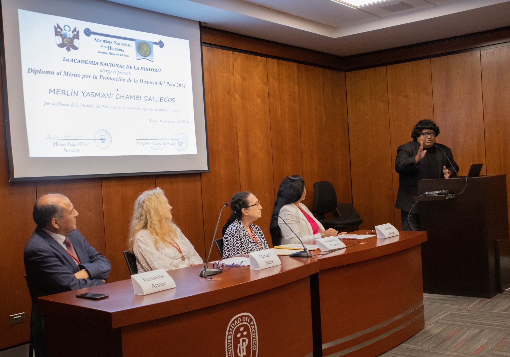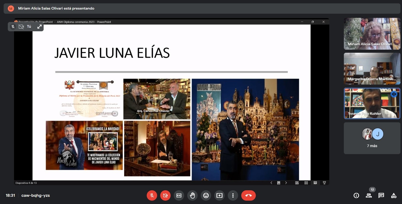 El 16 de febrero de 2024 fue la novena ceremonia anual de entrega del Diploma al Mérito por la Promoción de la Historia del Perú. Fue una ceremonia muy cálida y llena de sabiduría por parte de los académicos y de los diplomados en sus discursos. Son ya 36 peruanos reconocidos por la Academia Nacional de la Historia por su pasión por la historia que no es otra que por el desarrollo del Perú. Los premiados fueron Milena Vega-Centeno, César Coloma, Merlín Chambi y Cristian Silvera. Estamos seguros que ellos -como los anteriores diplomados- seguirán en la brega de hacer patria desde la Academia.
