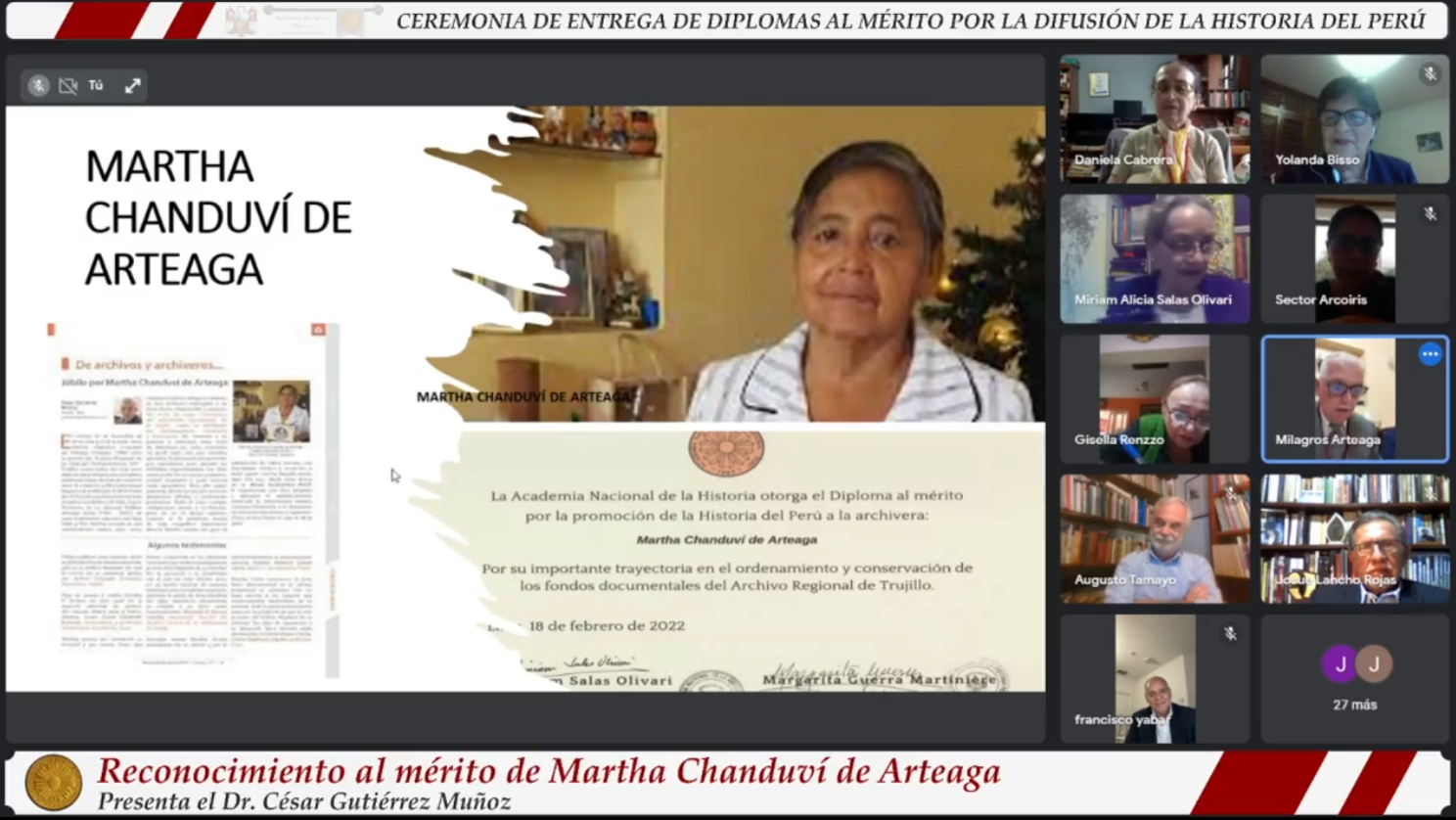 Martha Chanduví de Arteaga, por su acuciosa labor en el ordenamiento y conservación de los fondos documentales del Archivo Regional de Trujillo.